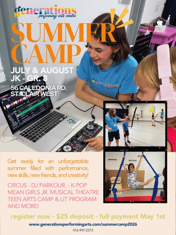 Generations Performing Arts Centre Summer Camp is an inclusive performing arts experience for students of all skill levels, identities and bodies, ages 4–13. Each day, campers explore their creativity, build confidence, and most importantly—have fun in a supportive, non-competitive environment rooted in community and creation. Through performing arts, media arts, parkour, aerial and martial arts, students are encouraged to shine both in their creative moments and performing moments, while forming meaningful connections with their fellow campers, LITs (leaders-in-training) and faculty.
