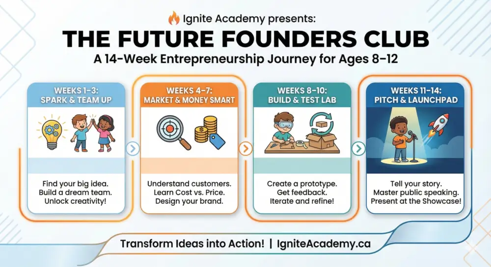 What makes this program special? The Future Founders Club is not a business class; it is an innovation incubator designed specifically for children ages 8–12. Unlike traditional academic enrichment that focuses on rote learning, our program uses Project-Based Learning to bridge the gap between “having an idea” and “making it happen.” We combine the excitement of a startup lab with the structure of an academic curriculum, ensuring that while students are having fun building prototypes and designing logos, they are simultaneously mastering critical life skills like financial literacy, public speaking, and resilience.