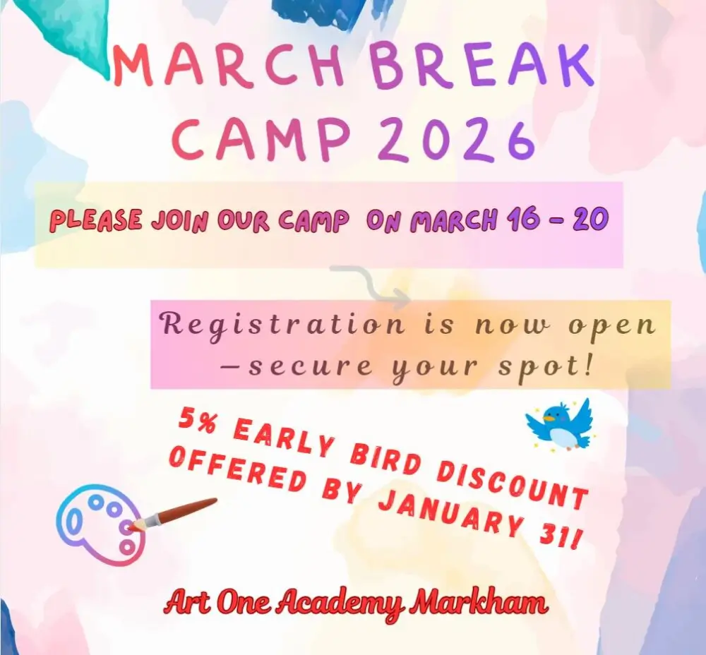 Please register ONLINE (https://www.artoneacademy.com/markham/register/?program=march-break-art-camp), by e-mail: rita@artoneacademy.com or call us at: 905-604-9395.
