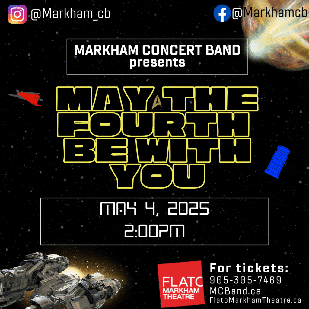 The Markham Concert Band is honouring Star Wars Day with an assortment of science fiction and fantasy music – Star Wars, Star Trek, Lord of the Rings, Dr. Who and more. Live long and prosper!