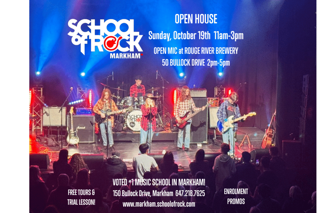 Please stop by the School of Rock Markham’s Open House at 150 Bullock Drive in Markham anytime between 11 am and 3 pm on October 19, 2025, for a FREE trial and tour of our fabulous facility. Parking is available on both sides of the building.