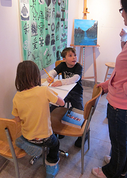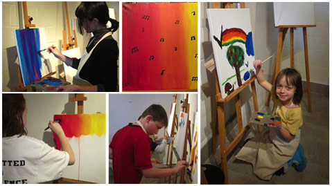 Our group consisted of myself, my two sons and two girls – ages ranging between 6 and 12 years. Everyone was given an apron to wear – essential attire for all of us! The paint ‘buffet’ was pointed out to us – acrylic paints are set out in pump bottles, pots are filled with an assortment of brushes, along with other materials you might want to experiment with – there was lots of freedom to use whatever we wanted.