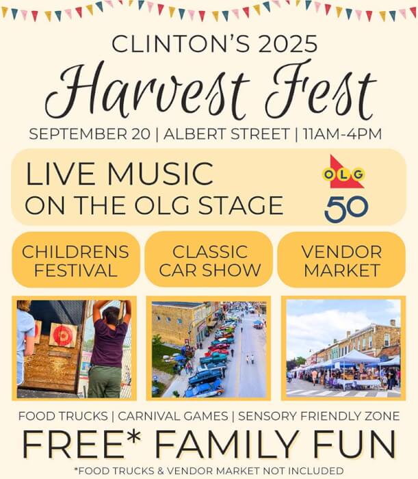 Harvest Fest is coming to Clinton on September 20! Planning is underway for another amazing day. Featuring: Vendor market Classic car show Live music on the OLG Stage Sensory-friendly zone Rock climbing Bouncy castles Trackless train rides Pony ride carousel Giant inflatable slide Face painting Food trucks Book sale Sand pile Obstacle course Mini golf Giant Lego Magicians Jugglers
