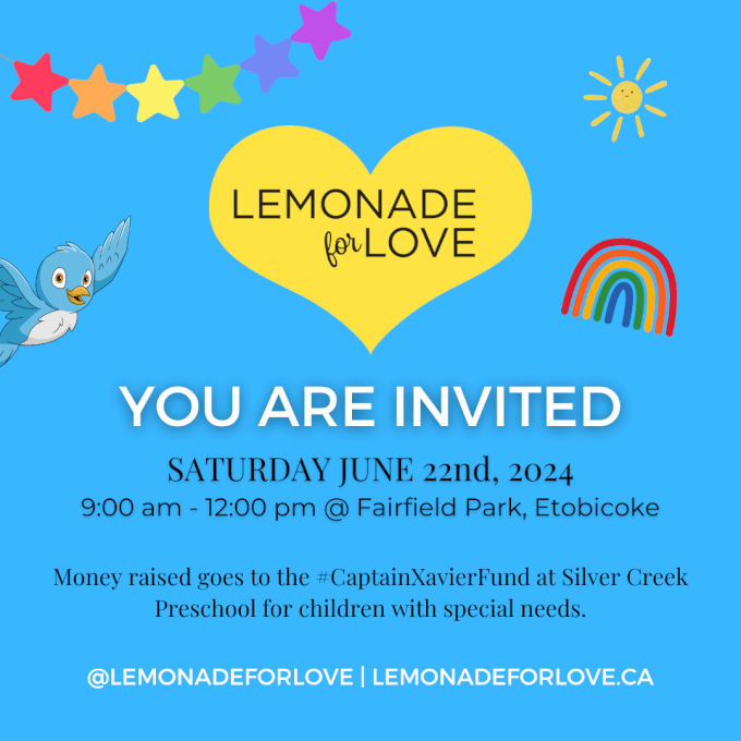 FeaturedFairfield Park 90 Lothian Avenue, Etobicoke, Ontario, CanadaFeatured EventLemonade for Love is a child-driven, parent-supported fundraising event all about #kidshelpingkids. It is an old fashioned lemonade stand that happens each June at Fairfield Park in Etobicoke. In 2023 we served over 1,000 cups of lemonade! All money raised goes to the #CaptainXavierFund at Silver Creek Preschool for children with special needs. Join us […]