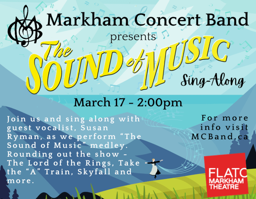 FeaturedFlato Markham Theatre 171 Town Centre Blvd, Markham, ON, CanadaFeatured EventJoin the Markham Concert Band and sing along with guest vocalist, Susan Ryman, as we perform “The Sound of Music” medley. Rounding out the show - The Lord of the Rings, Take the “A” Train, Skyfall and more.