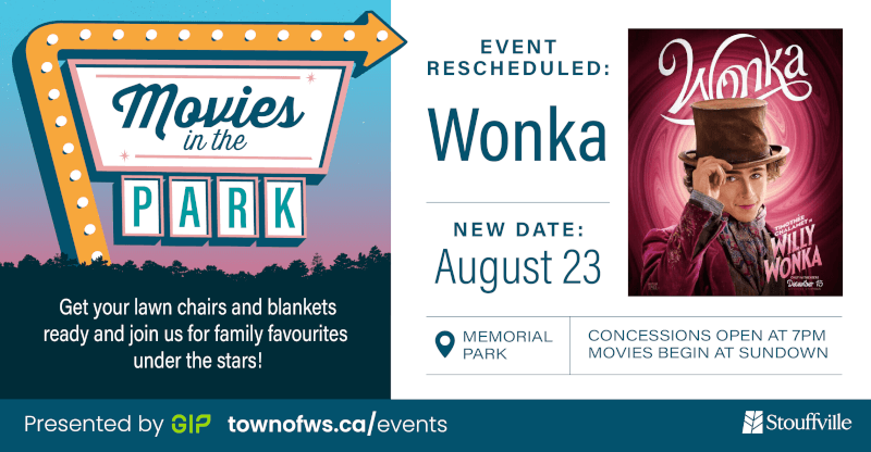 Memorial Park, Stouffville Burkholder St. & Park Dr., Stouffville, Ontario, CanadaGet your lawn chairs and blankets ready and join us in Memorial Park for family favourites under the stars! Wonka - RESCHEDULED TO FRIDAY AUGUST 23. Originally scheduled for Friday August 16, this event has been rescheduled to Friday August 23rd, due to weather concerns. All movies are free of charge and registration is not […]
