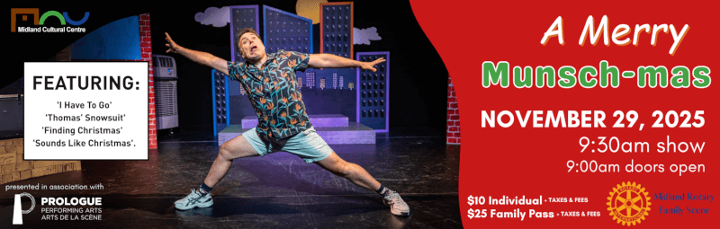 Midland Cultural Centre 333 King Street, Midland, ON, CanadaHoliday ConcertsFireside Munsch: Merry Munsch-mas. John Kennedy’s hit solo show is a high-energy performance featuring four of Robert Munsch’s classic stories performed as one wacky storytelling play. Merry Munsch-mas features holiday favourites 'I Have To Go', 'Thomas’ Snowsuit', 'Finding Christmas' and 'Sounds Like Christmas'. Purchase tickets online.