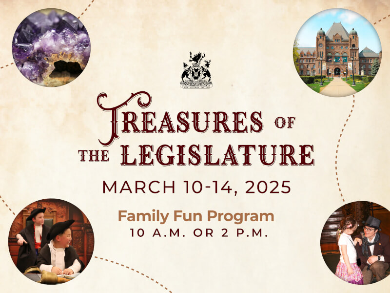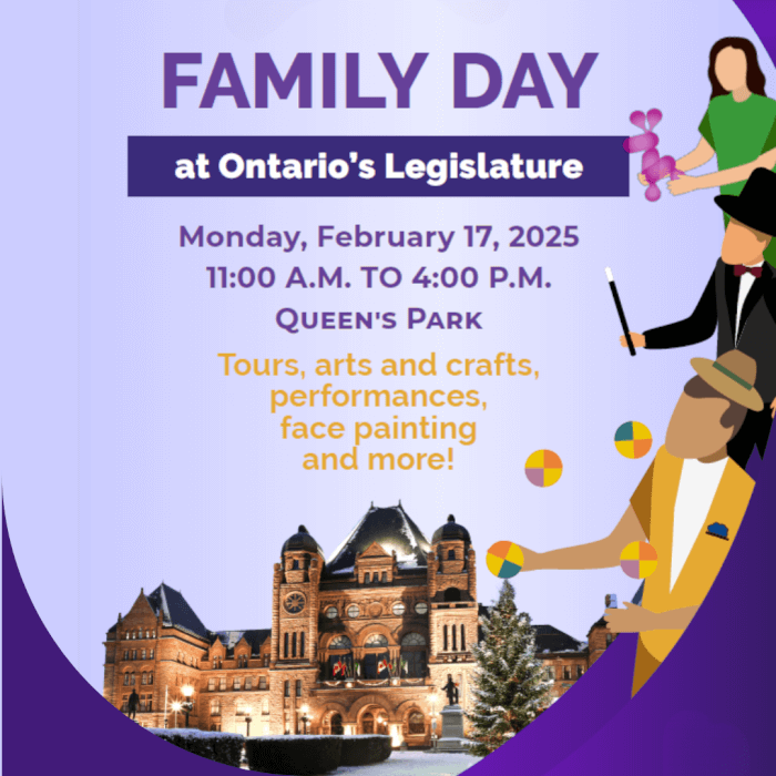 Ontario’s Legislative Building 111 Wellesley Street West, Toronto, ON, CanadaJoin us this Family Day to discover your Parliament with tours, crafts, live performances, and more! Ontario’s historic Legislative Building will be open to visitors this Family Day, Monday, February 17, 2025 from 11 a.m. to 4 p.m. This free event has something for everyone. Start your visit off with a guided tour, followed by […]